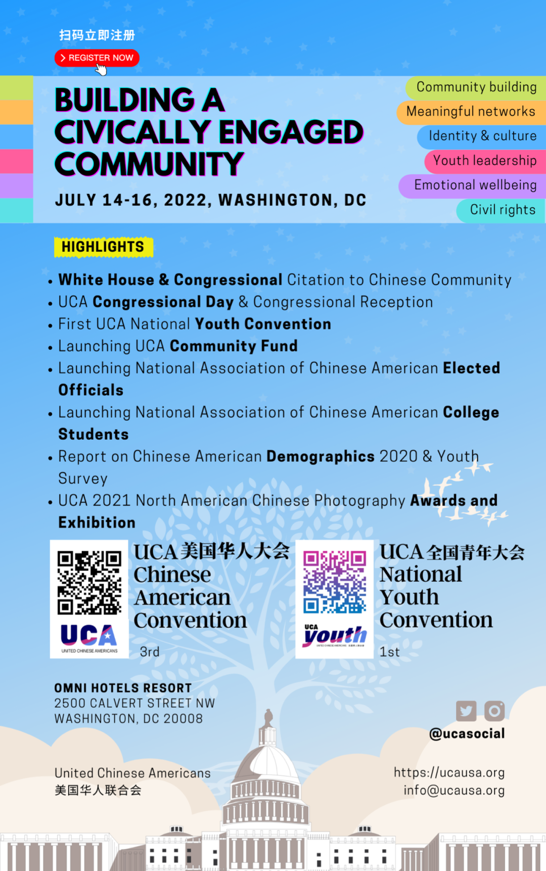 这将是美国华人历史上值得记住的三天:2022年7月14-16日,美国华人联合会(UCA)和其伙伴组织们将举办第三届“美国华人大会” (Chinese American Convention)和第一届“全国青年大会” (UCA National Youth Convention)。届时将有白宫官员、国会议员、华裔民选官员、智库学者、工商领袖、社会组织、社区领袖以及数百位关心华人社区发展的华裔朋友和下一代代表们聚集一堂,共商大计。这将是全美华人参政议政、培育下一代、彰显华人价值观和优良传统的又一里程碑。“美国华人大会”是一个全美华人的盛会,是一个开放的全美华人社区的交流平台;而“UCA全国青年大会”也是面对全美华人下一代的开放交流平台。